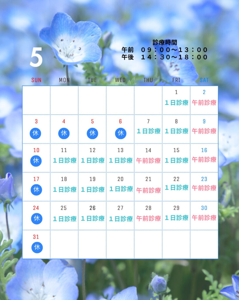 ゴールデンウィークは祝日のみ休診となります。連休明けの7日は木曜日ですが1日診療となります。